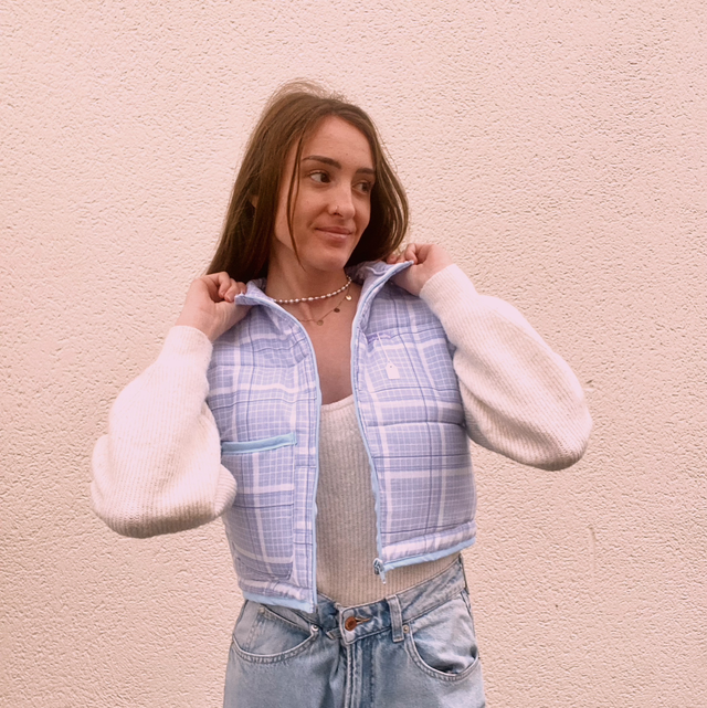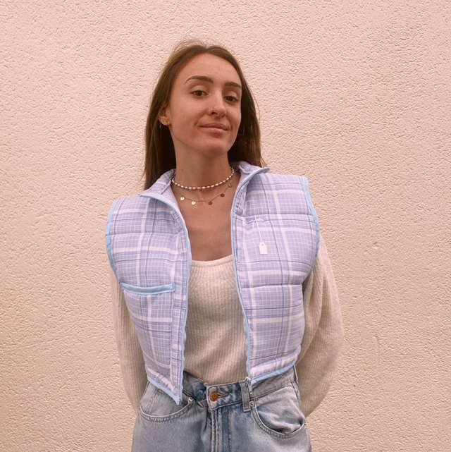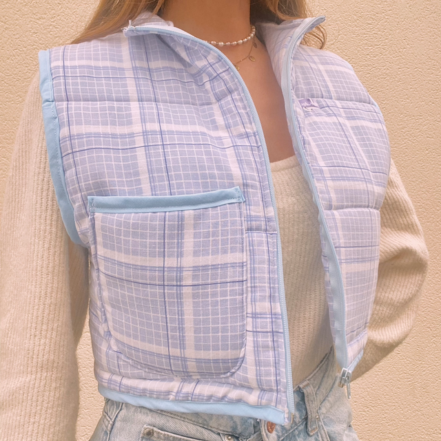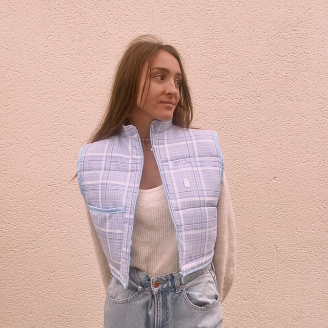 Cette doudoune sans manches est fabriqué entièrement main par mes soins, à partir de linge de maison chiné et de ouate pour la doublure afin de pouvoir la porter tout l'hiver.