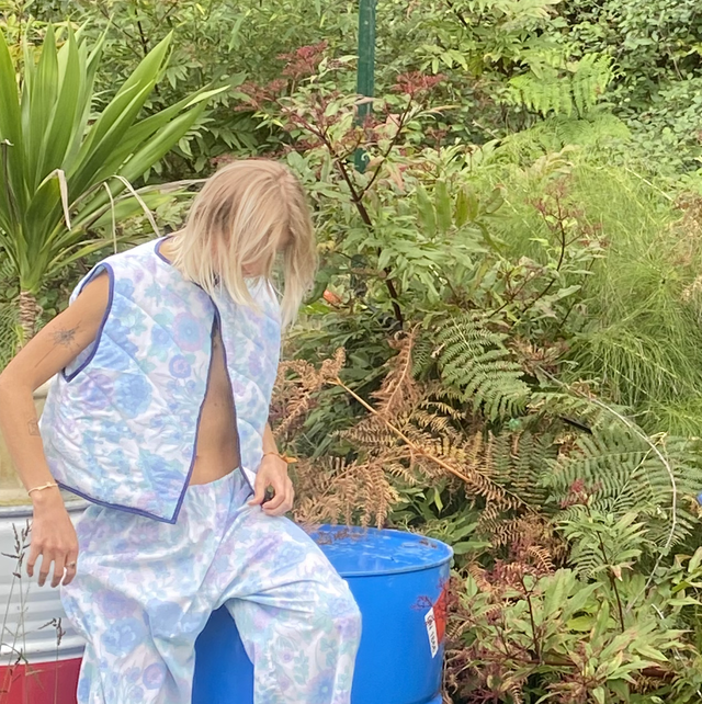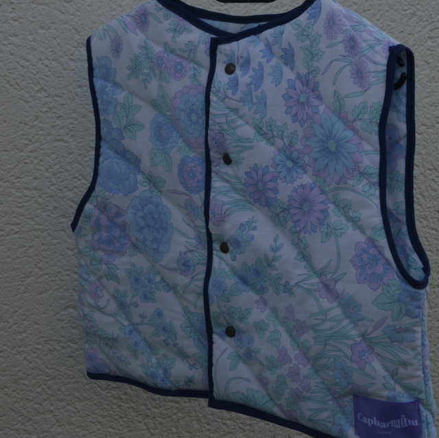Cette veste sans manche est fabriquée entièrement par mes soins. Elle est composée de linge de maison vintage, ainsi que de ouate pour la doublure.